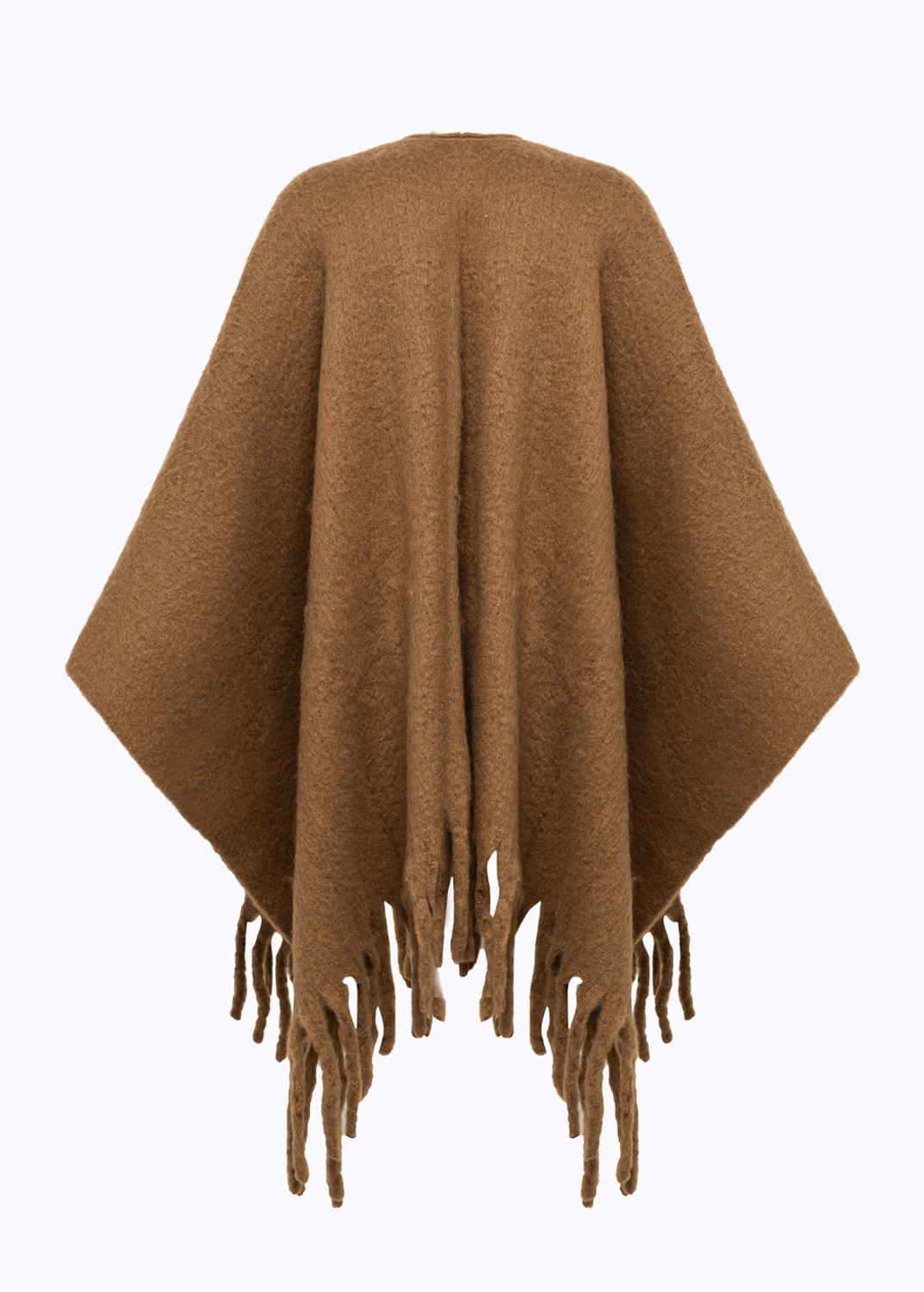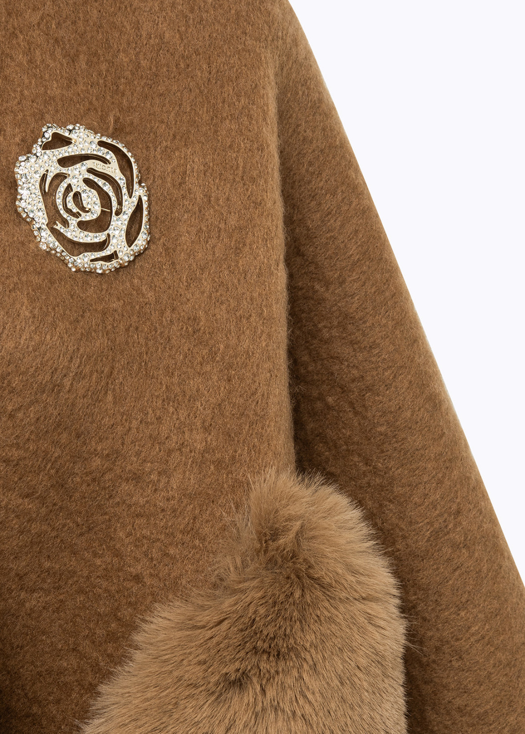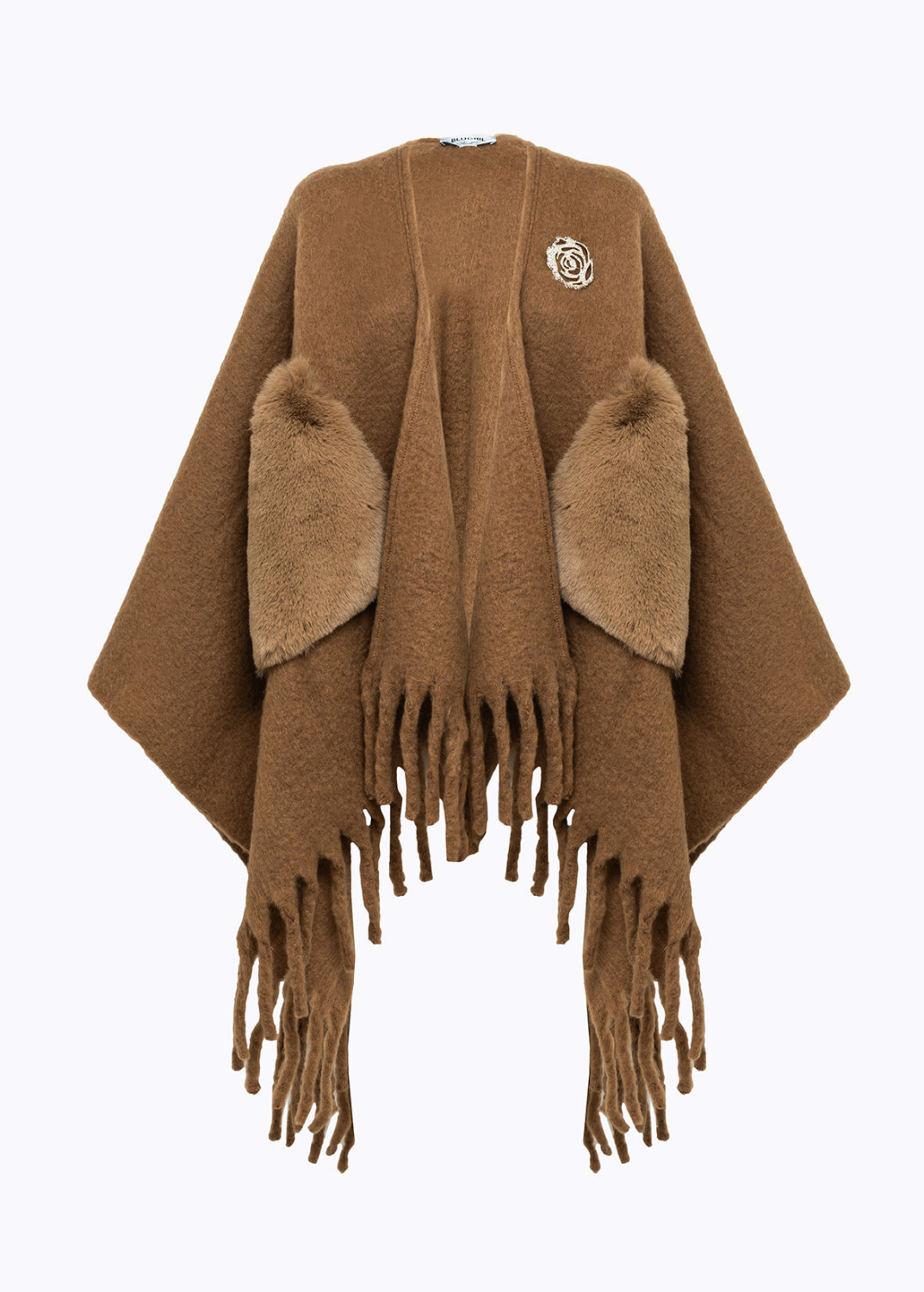 ELEGANT DESIGN FOR THIS WOOL-BLEND PONCHO WITH FAUX FUR POCKETS AND FRINGES AT THE BOTTOM. METAL ROSE PIN DETAILING. SIZE: WIDTH 150 CM, LENGTH 150 CM COMPOSITION: 85% POLYESTER 15% WOOL