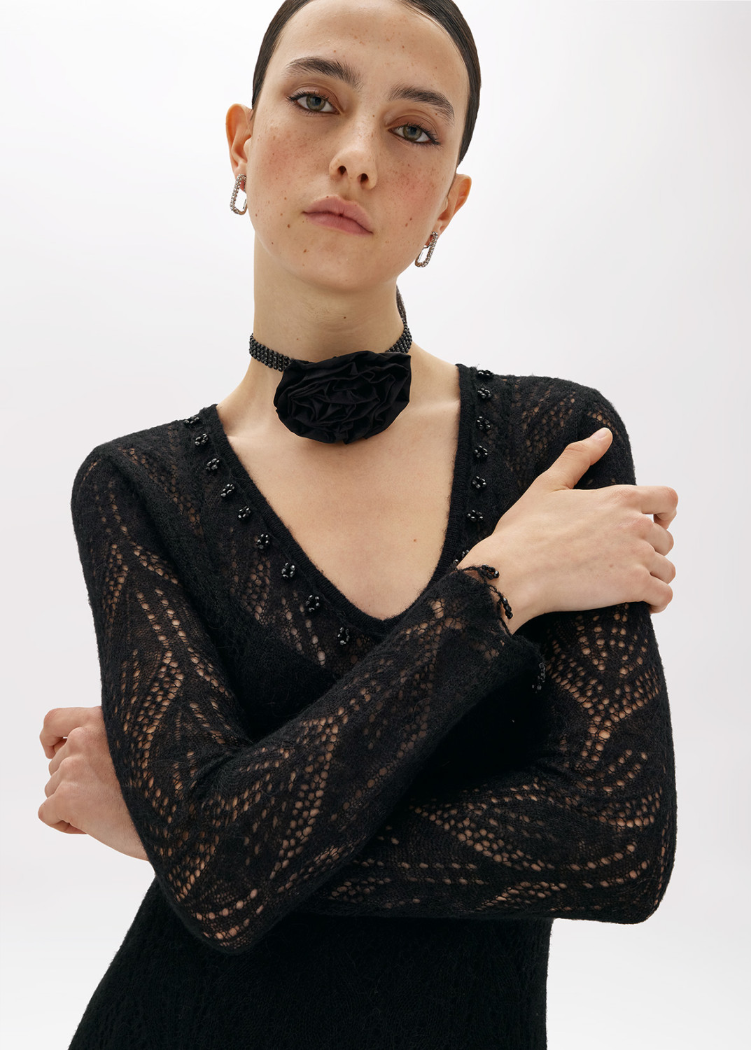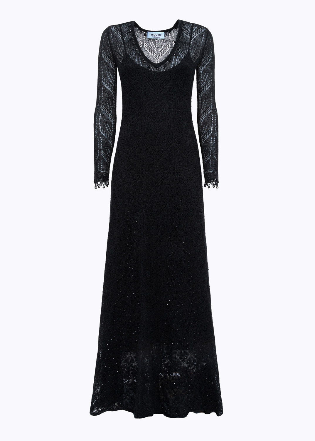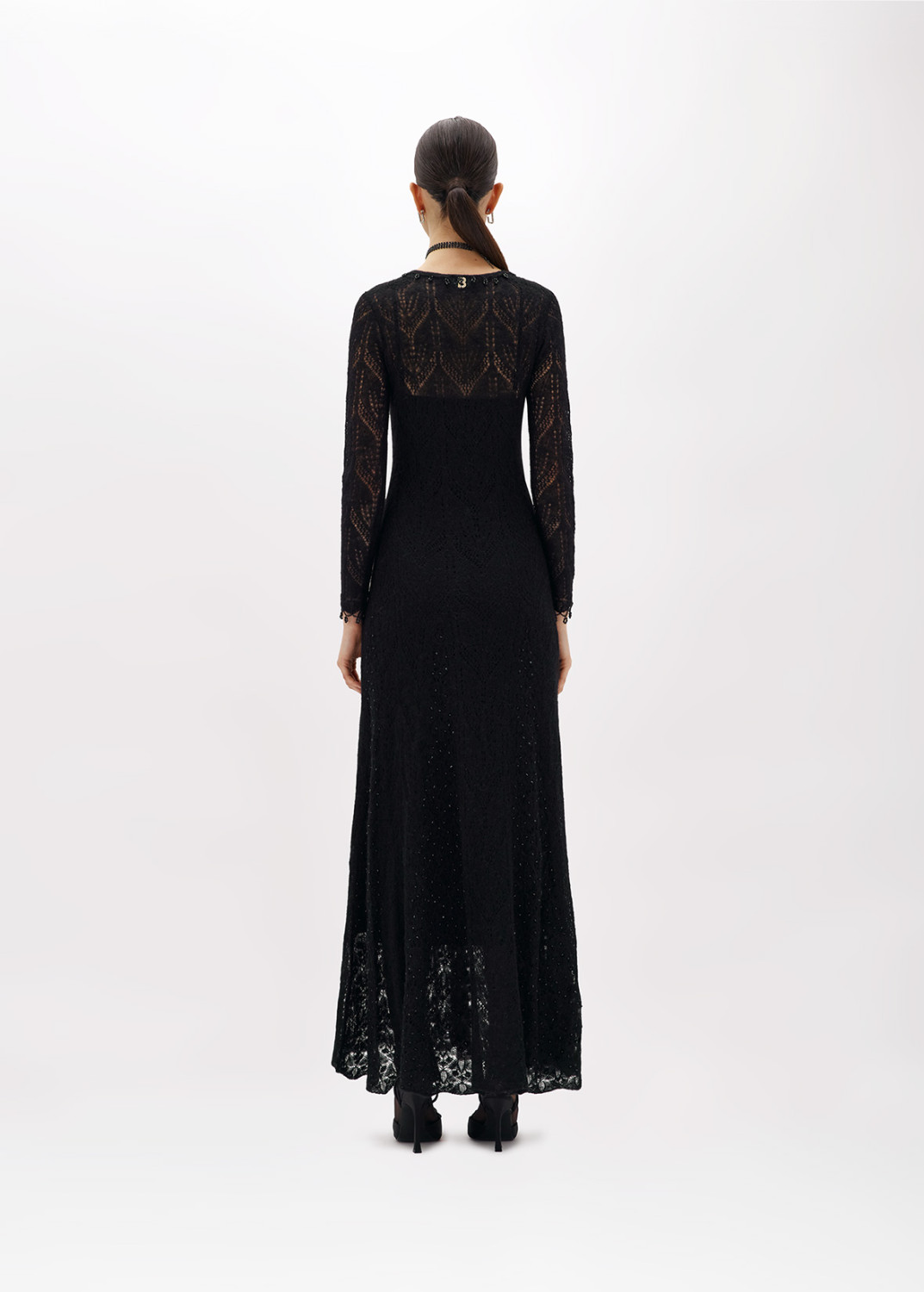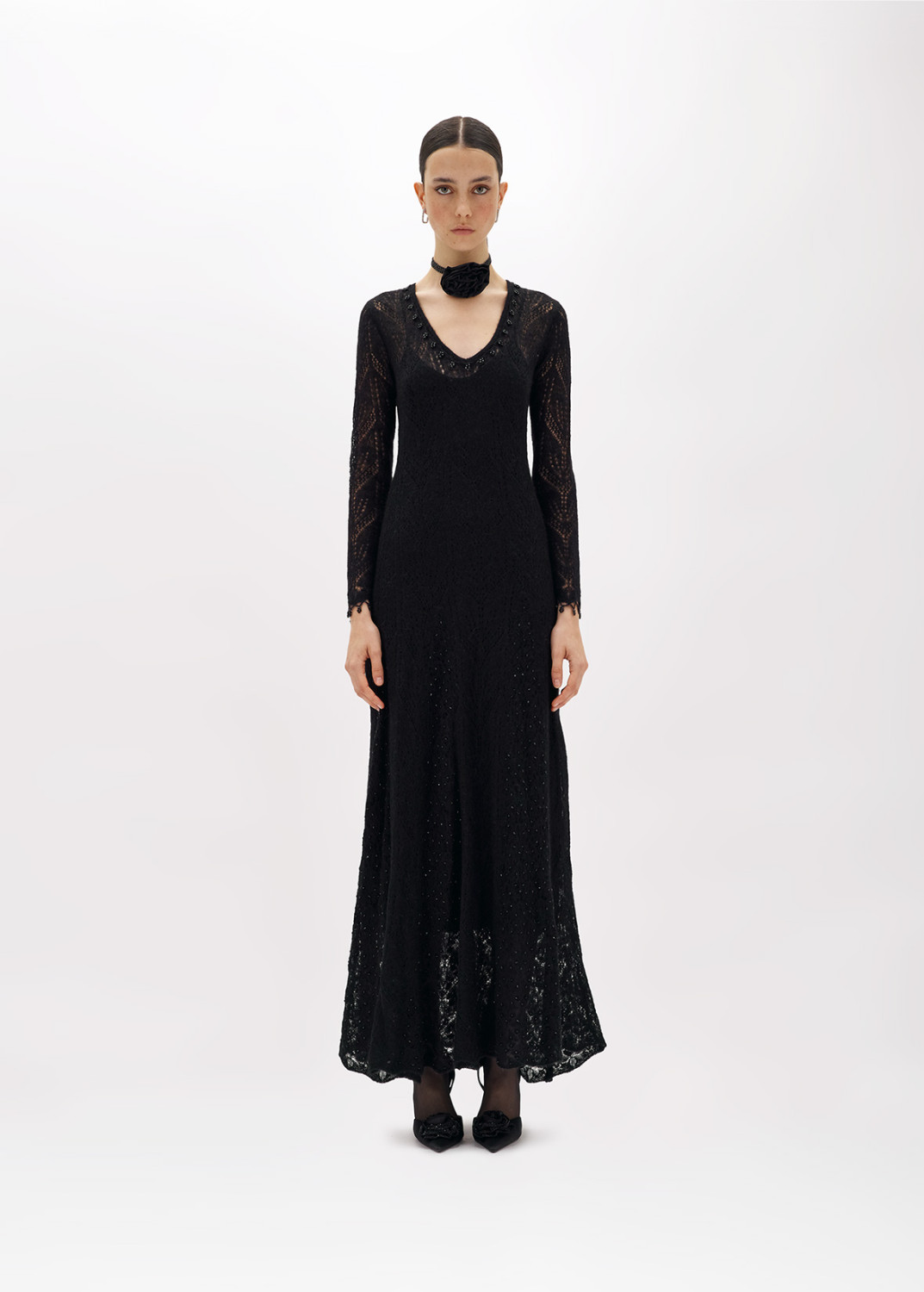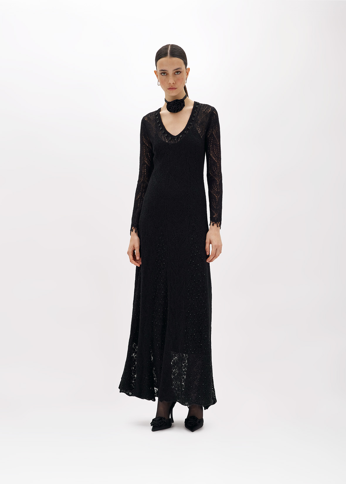 AN INTRIGUING EMBROIDERY IS THE HIGHLIGHT OF THIS LONG DRESS IN WOOL AND ALPACA BLEND LACE-EFFECT KNIT, ADORNED WITH BEADS AND JET STONES. V-NECKLINE, LONG SLEEVES, FLARED SKIRT WITH PANEL CONSTRUCTION. THE PERFECT CHOICE FOR A SPECIAL OCCASION. COMPOSITION: 40% POLYAMIDE 30% WOOL 30% ALPACA