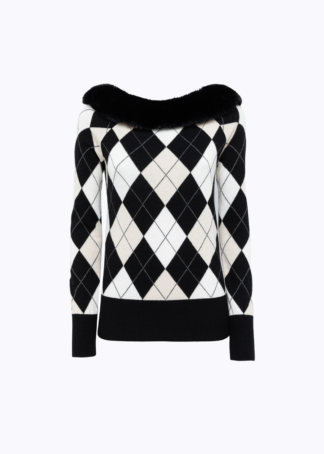 GIVE A GRAPHIC TOUCH TO YOUR STYLE WITH THIS VISCOSE AND WOOL BLEND SWEATER WITH BI-COLOR ARGYLE DIAMOND INLAY AND WITH REMOVABLE FAUX FUR TRIM. REGULAR CUT, BOAT NECK, LONG SLEEVES, SOLID COLOR HEMS. IDEAL ALSO FOR COMPLETING A SPECIAL LOOK. COMPOSITION: 33% VISCOSE 23% POLYAMIDE 20% WOOL 20% COTTON 4% CASHMERE