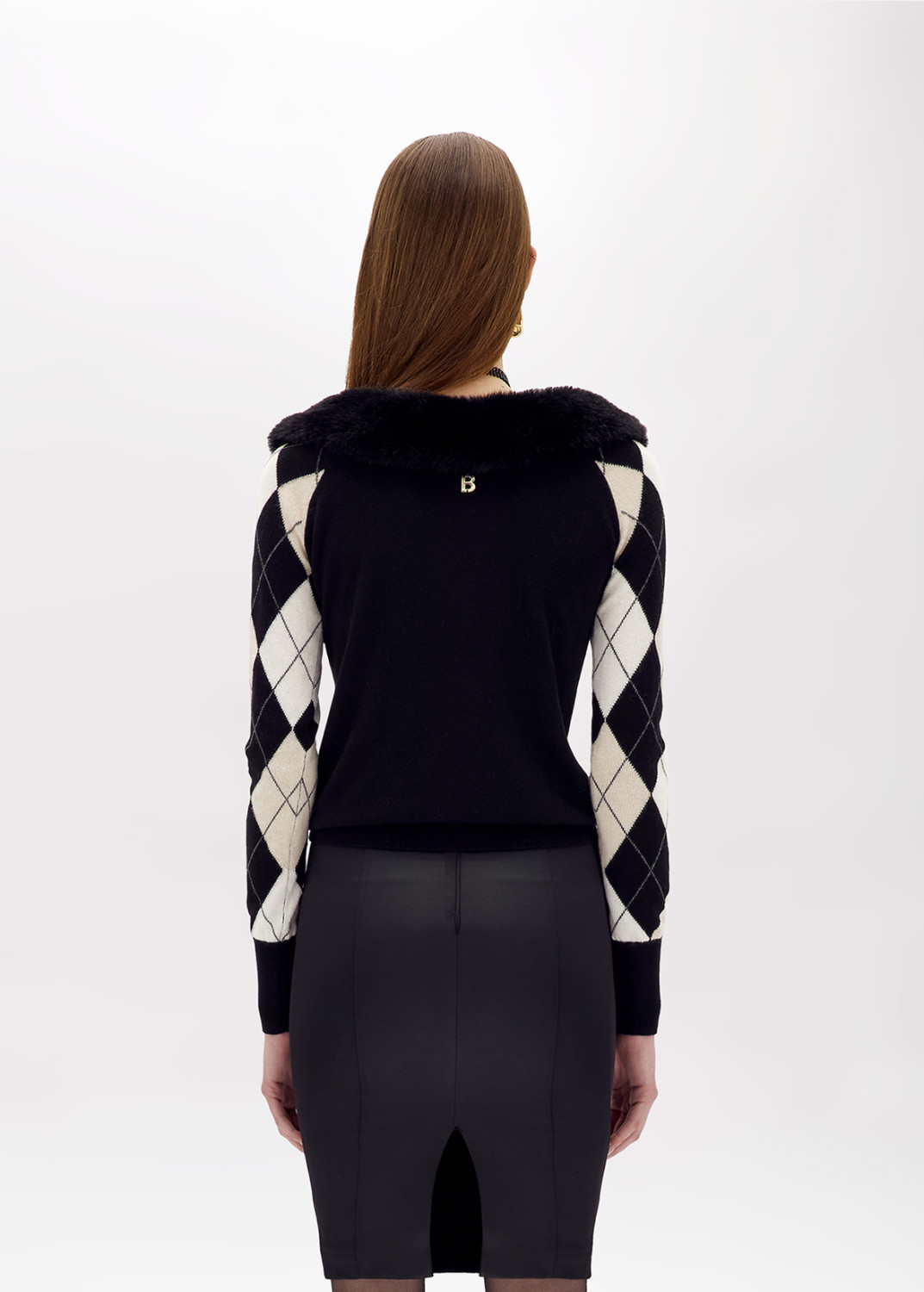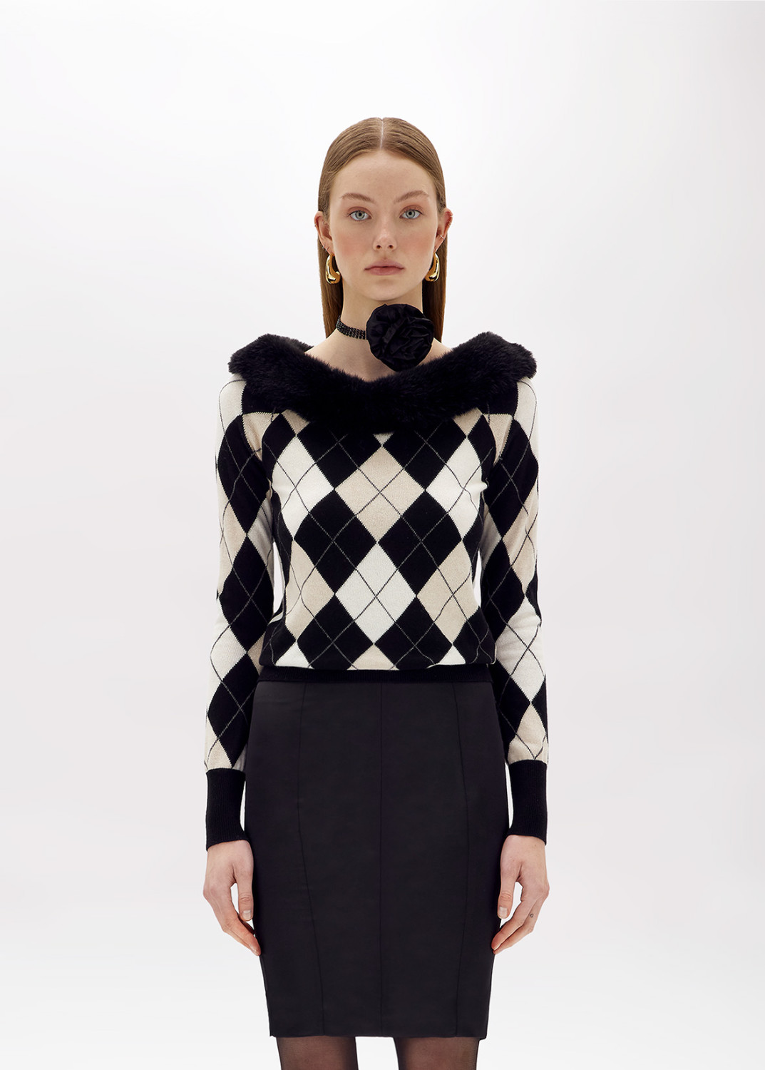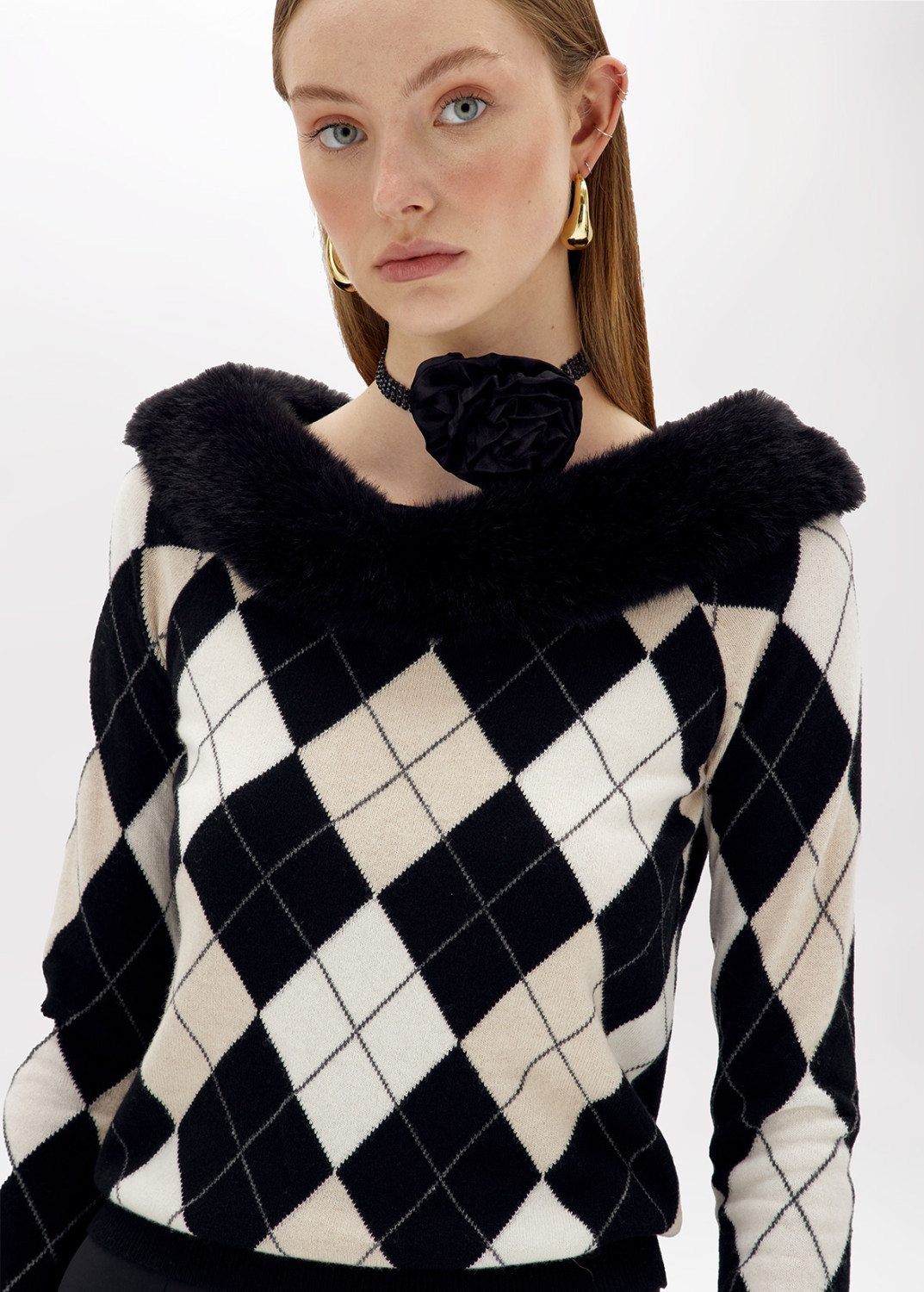 DIAMOND PATTERN SWEATER WITH FAUX FUR COLLAR