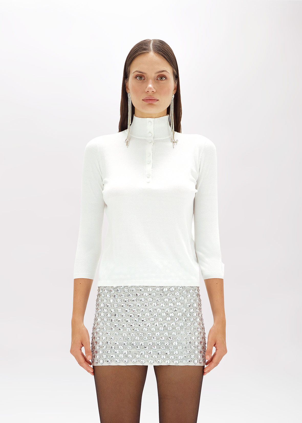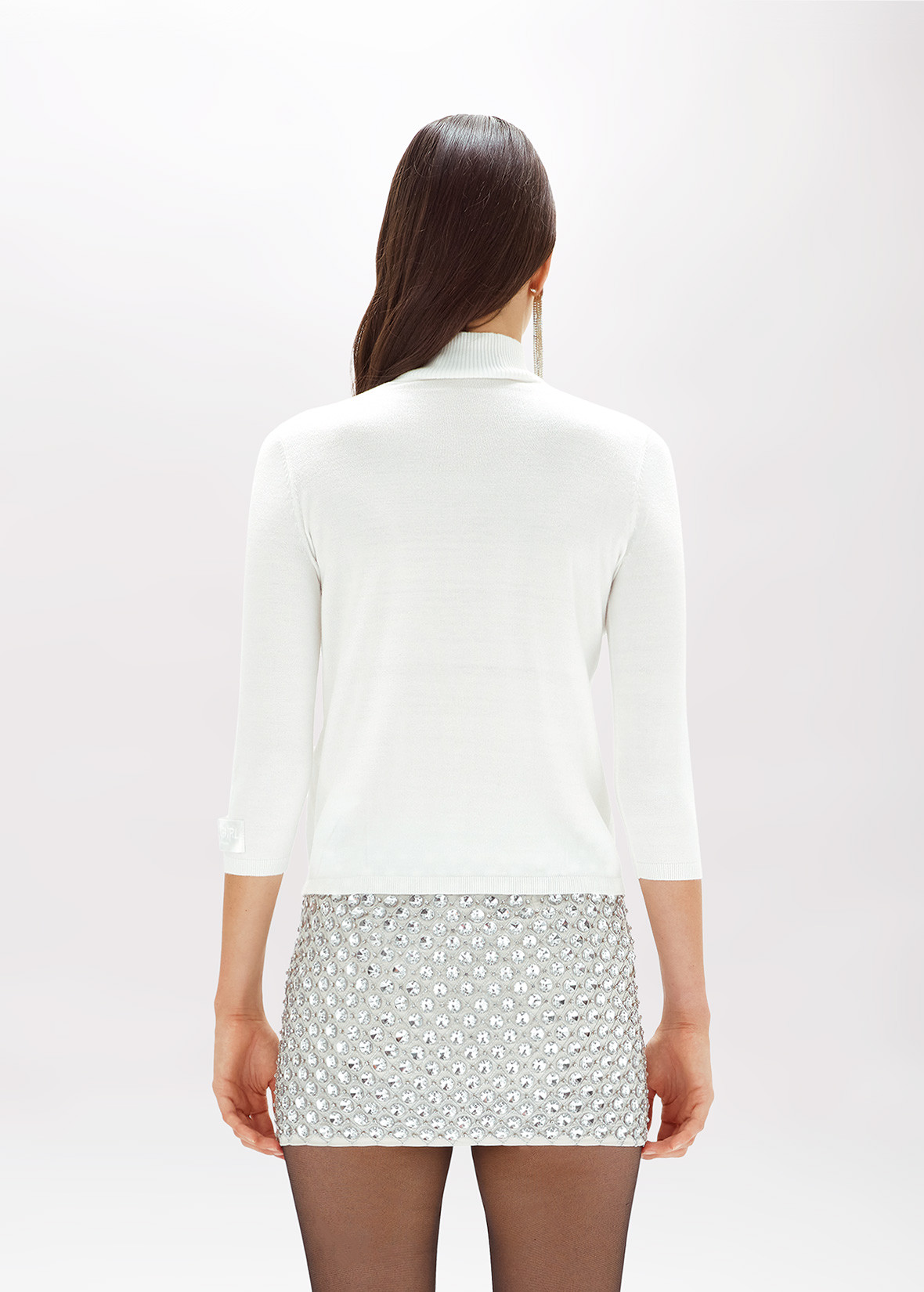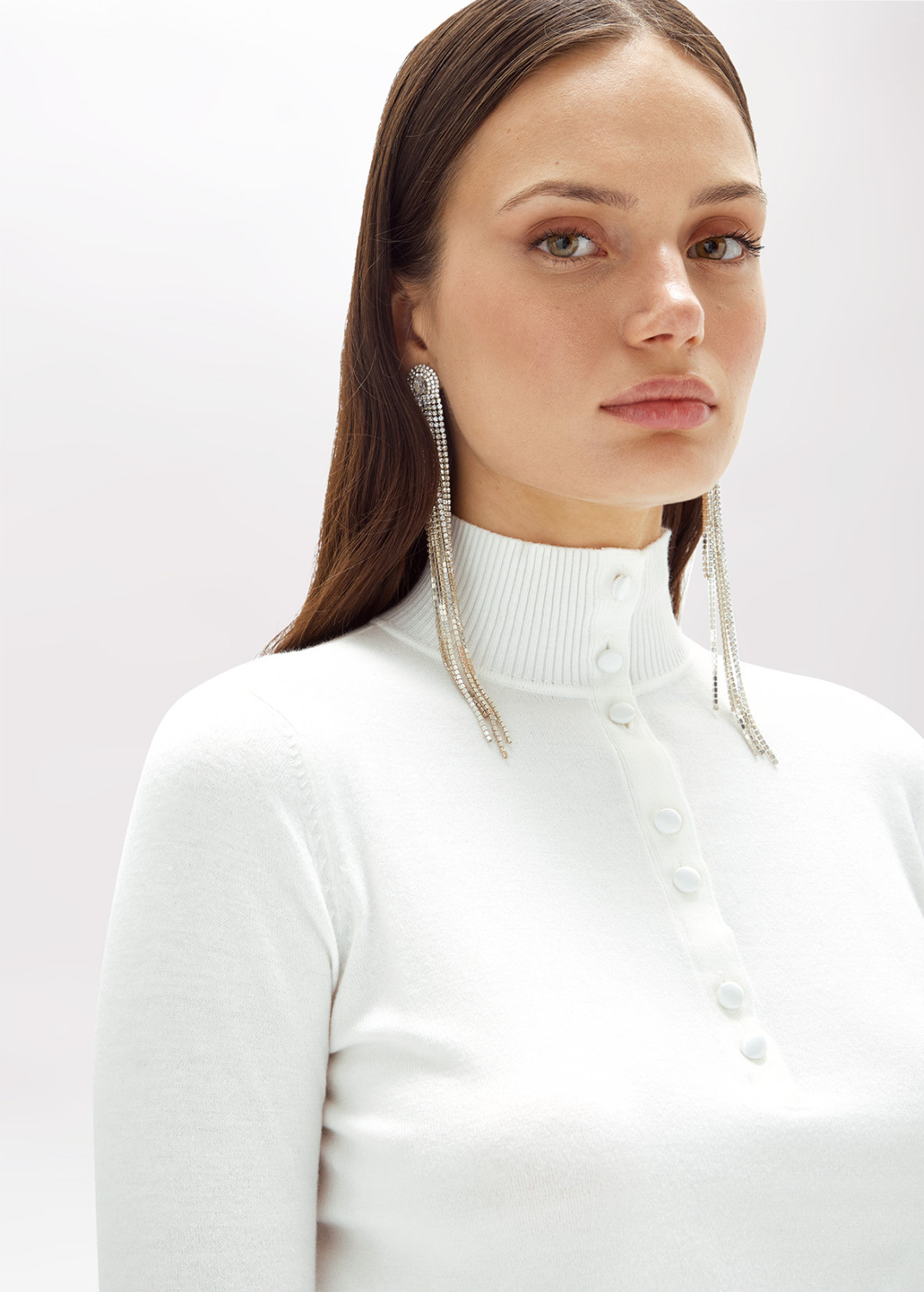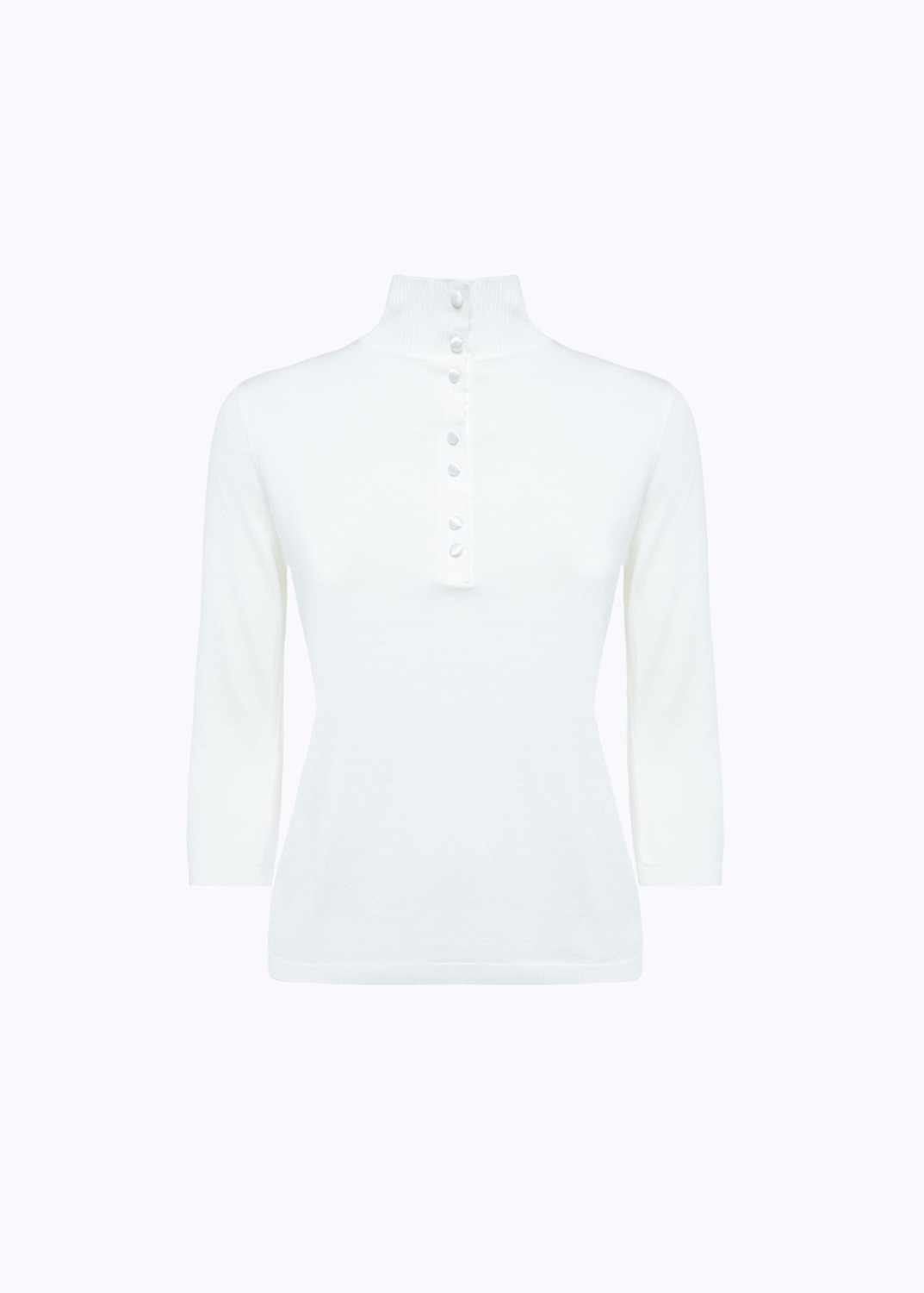 TRENDY CUT FOR THIS TURTLE NECK SWEATER IN VISCOSE BLEND WITH A SOFT-TOUCH CASHMERE EFFECT. REGULAR CUT, RIBBED TURTLE NECK, SATIN-COVERED BUTTON CLOSURE, FINISHED INTERNALLY WITH RIBBON, THREE-QUARTER SLEEVES, SATIN LABEL WITH EMBROIDERED LOGO. ESSENTIAL AND PERFECT IN A MYRIAD OF LOOKS. COMPOSITION: 55% VISCOSE 45% POLYAMIDE