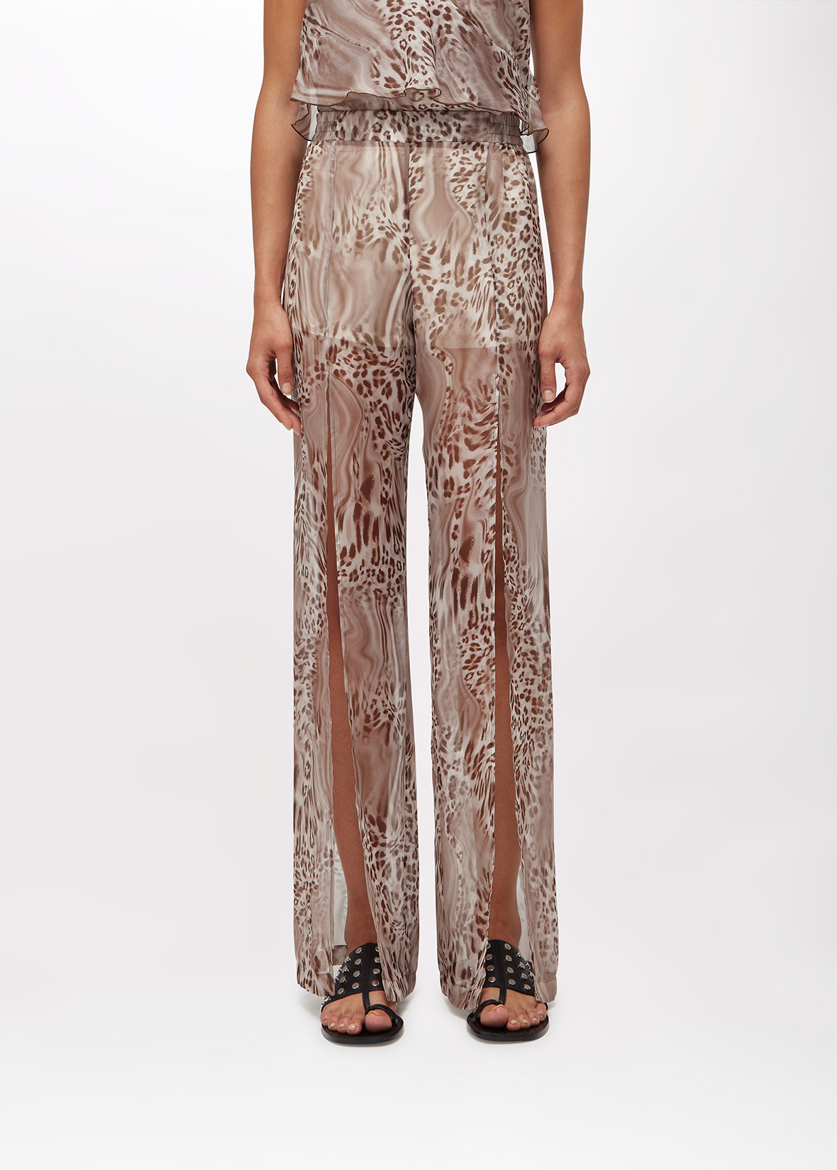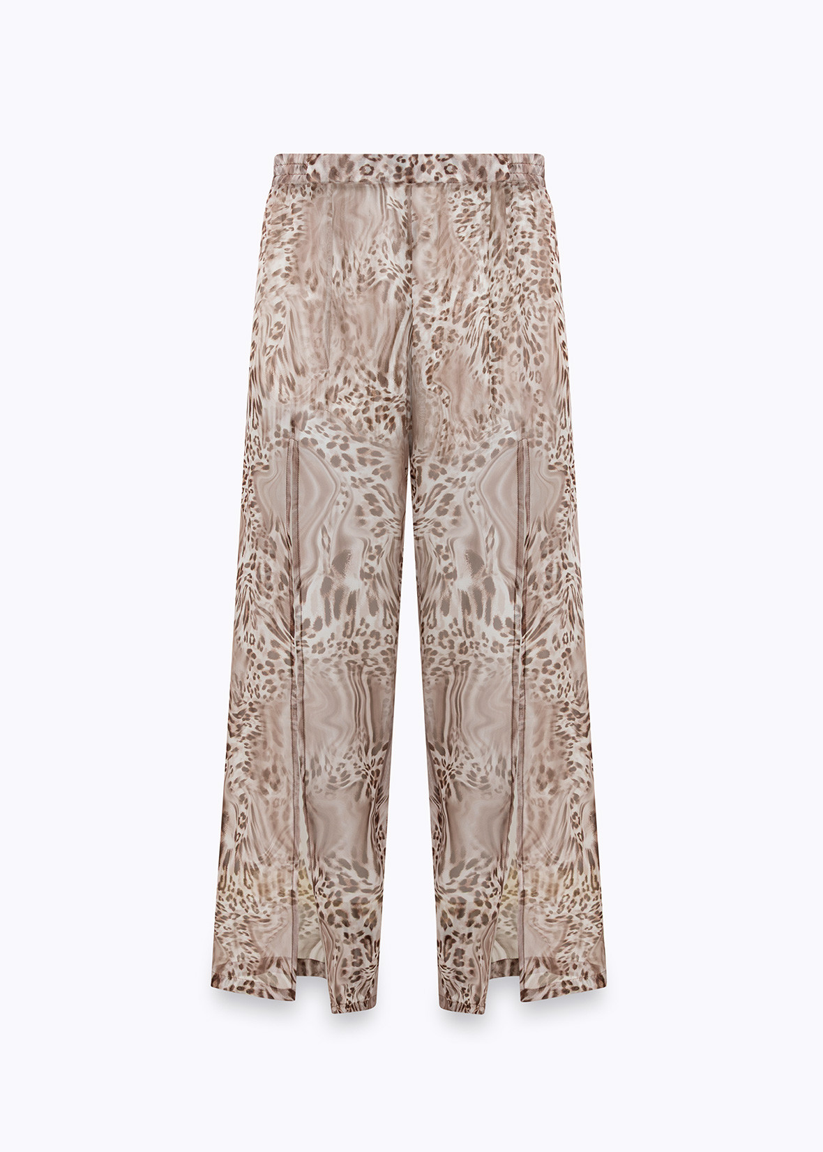 THESE ANIMAL-PRINT CHIFFON TROUSERS GLIDE EFFORTLESSLY ALONG THE SILHOUETTE. DESIGNED WITH AN ELASTICATED WAISTBAND AND A WIDE-LEG CUT, THEY SLIP ON WITH EASE AND ADD A GRAPHIC, STATEMENT TOUCH TO ANY LOOK. COMPOSITION: 100% POLYESTER